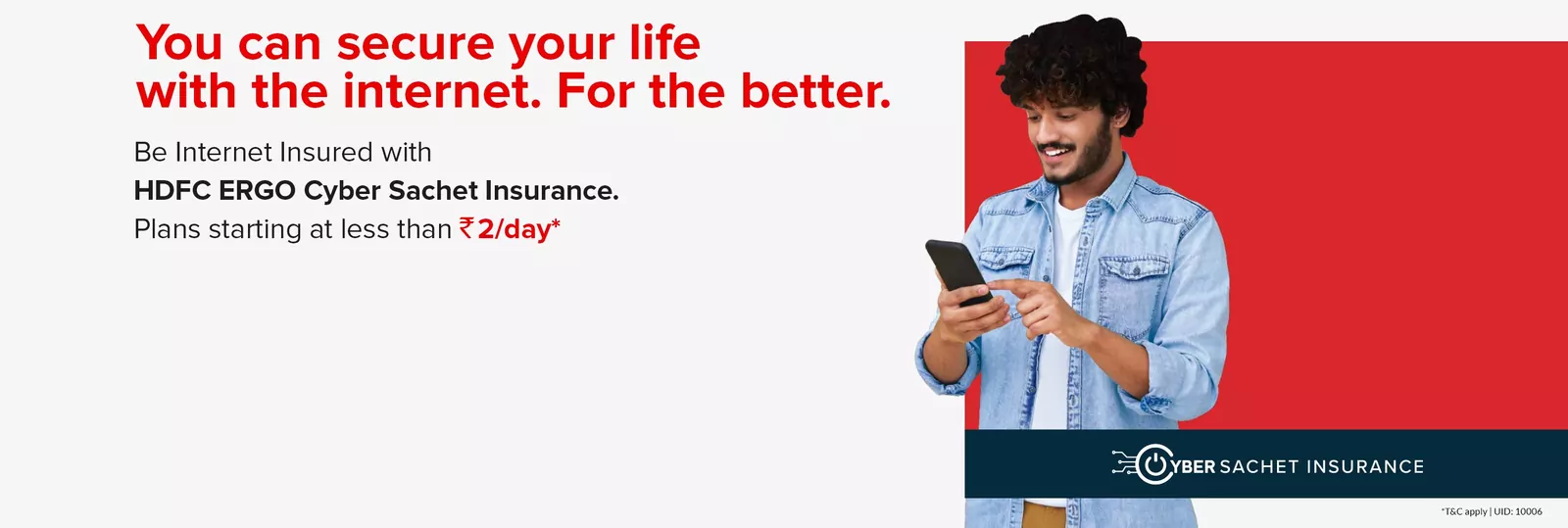 આજકાલ, ડિજિટલ ચુકવણીનું ચલણ બહુ વધી ગયું છે, પરંતુ તેમાં સંદિગ્ધ ઑનલાઇન વેચાણ અને છેતરપિંડીવાળા ટ્રાન્ઝૅક્શન પણ થાય છે. સાઇબર ઇન્શ્યોરન્સ તમારા નુકસાનને ઑનલાઇન સુરક્ષિત કરી શકે છે અને જો કંઈપણ ખોટું થતું હોય તો તમે સુરક્ષિત રહો તેની ખાતરી કરે છે. તે તમને સાઇબર ધમકીઓના કારણે ફાઇનાન્શિયલ નુકસાનની સતત ચિંતા કર્યા વિના તમારી ઑનલાઇન પ્રવૃત્તિઓ કરવામાં મદદ કરશે. ઑનલાઇન સર્ફિંગ કરતી વખતે, તમે તમારી પ્રવૃત્તિની પ્રકૃતિના આધારે વિવિધ પ્રકારના જોખમોનો સામનો કરો છો. તેથી, એચડીએફસી અર્ગોએ સાઇબર સૅશે ઇન્શ્યોરન્સ ડિઝાઇન કર્યું છે, જે તમારી જરૂરિયાતોને પૂર્ણ કરવા માટે સંપૂર્ણપણે કસ્ટમાઇઝ કરી શકાય છે અને તેથી તમને કોઈપણ તણાવ અથવા ચિંતા વગર ડિજિટલ રીતે કાર્ય કરવામાં મદદ મળે છે.