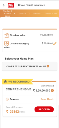 You get cover for your home building and contents against fire, allied risks, and natural disasters. The sum insured is calculated by multiplying the construction cost by the carpet area.