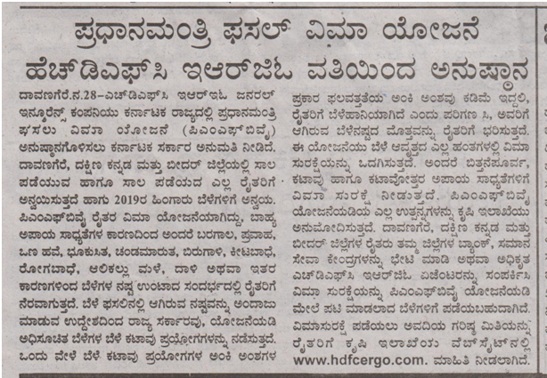 ಹೆಚ್.ಡಿ.ಎಫ್.ಸಿ ಎರ್ಗೊ ಜನರಲ್ ಕಂಪೆನಿಯನ್ನು ಕರ್ನಾಟಕ ಸರ್ಕಾರದ ವತಿಯಿಂದ ನಿಯೋಜಿಸಿದ್ದು ಅವರ ಮೂಲಕ ಪುನರ್ ರಚನೆಯಾದ ಹಾವಾಮಾನ ಆಧಾರಿತ ಬೆಳೆ ವಿಮಾ ಯೋಜನೆ (ಆರ್-ಡಬ್ಲೂ ಬಿ ಸಿ ಐ ಎಸ್) ಅನ್ನು ಬೆಳೆ ಸಾಲ ಪಡೆದ ರೈತರು ಹಾಗೂ ಬೆಳೆ ಸಾಲವನ್ನು ಪಡೆಯುವ ರೈತರಿಗೆ ಬೆಂಗಳೂರು (ಗ್ರಾಮಾಂತರ ಮತ್ತು ನಗರ) ಜಿಲ್ಲೆ,ಬೀದರ್,ದಾವಣಗರೆ,ದಾವಣಗೆರೆ ಜಿಲ್ಲೆಯವರಿಗೆ ಅನ್ವಯವಾಗುವಂತೆ ಹಾಗೂ ಕೆಳಕಾಣಿಸಿರುವ ಬೆಳೆಗಳ ಮೇಲೆ ಮುಂಗಾರು ಹಂಗಾಮಿಗೆ ಜ್ಯಾರಿಯಾಗುವುವು.