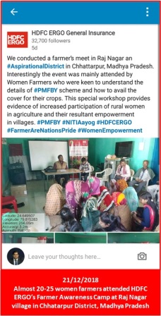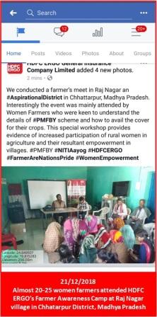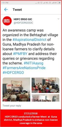 HDFC ERGO had the opportunity to be a part of the second phase of Krishi Kalyan Abhiyan initative of the Government of India. As per this campaign we targeted 100 villages across 4 districts; 3 in Madhya Pradesh (Chhatarpur, Damoh & Guna)